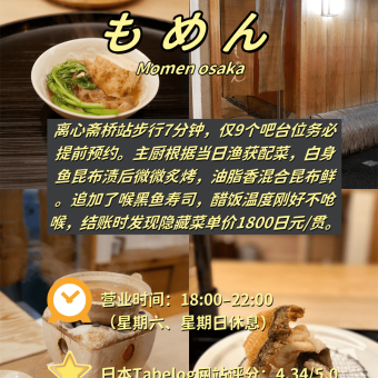​​附预约技巧+招牌吃法+性价比推荐 1️⃣ ​​TOMONO(吧台互动体验)​​ 📍 ​​梅田站步行8分钟|U型吧台​​⏰ 18:00-23:00|🚫 ​​周…
