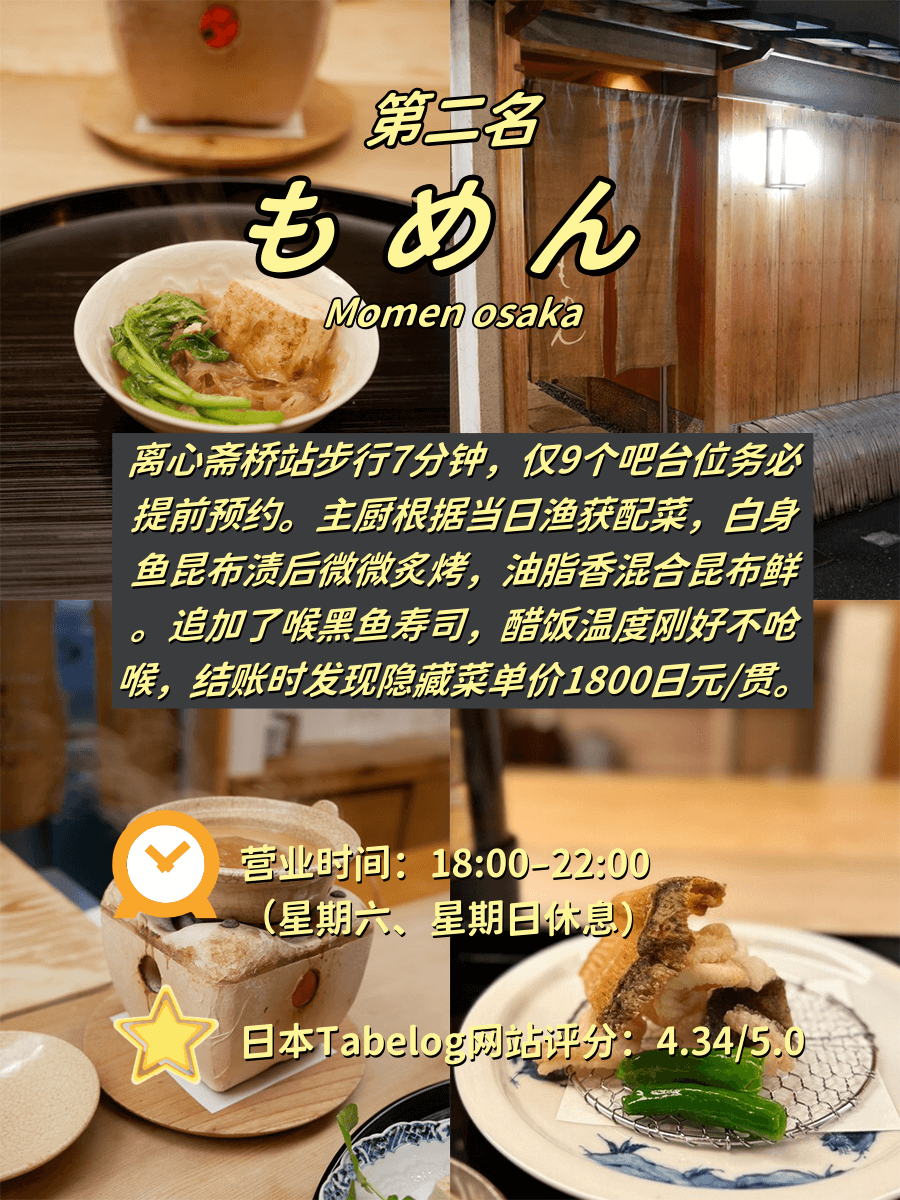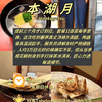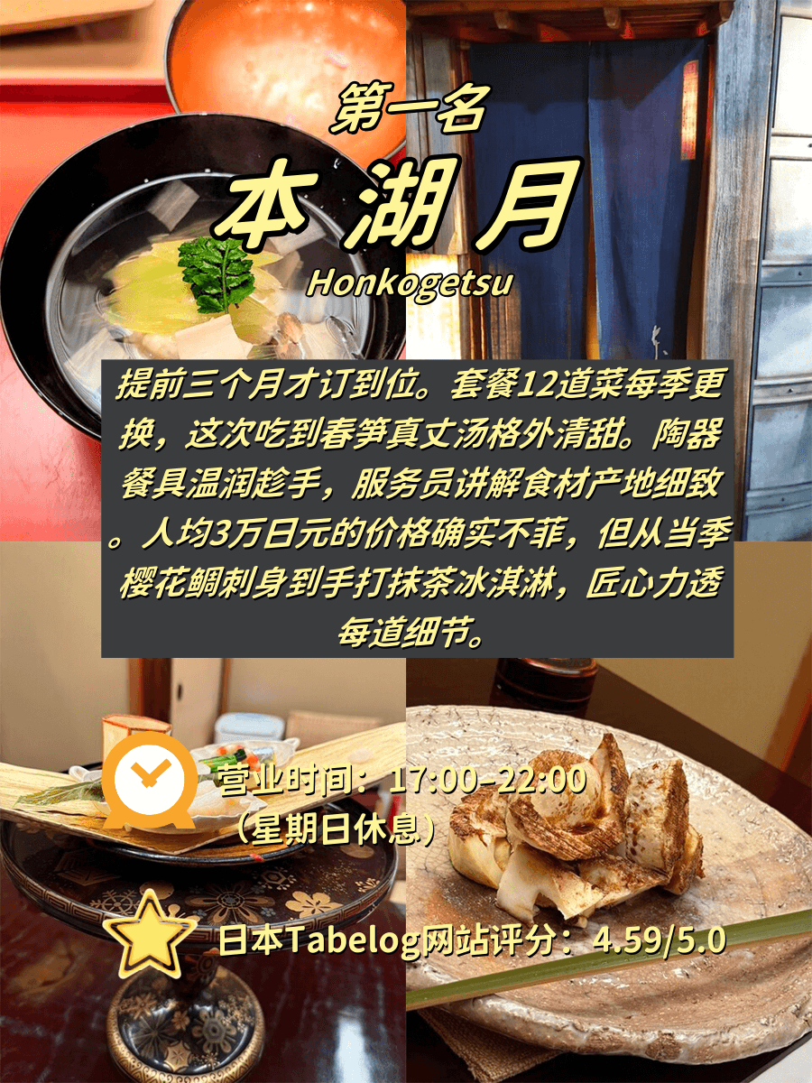 1️⃣ 本湖月(评分4.59|第1名)​​ 📍 ​​心斋桥站步行10分钟​​ ⏰ 17:00-22:00|🚫 ​​周日休息​​|💰 ​​约3万日元/人​​ ✅ …