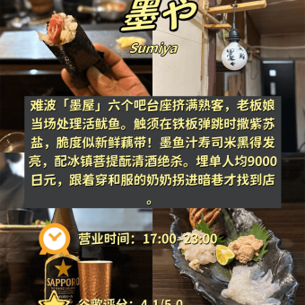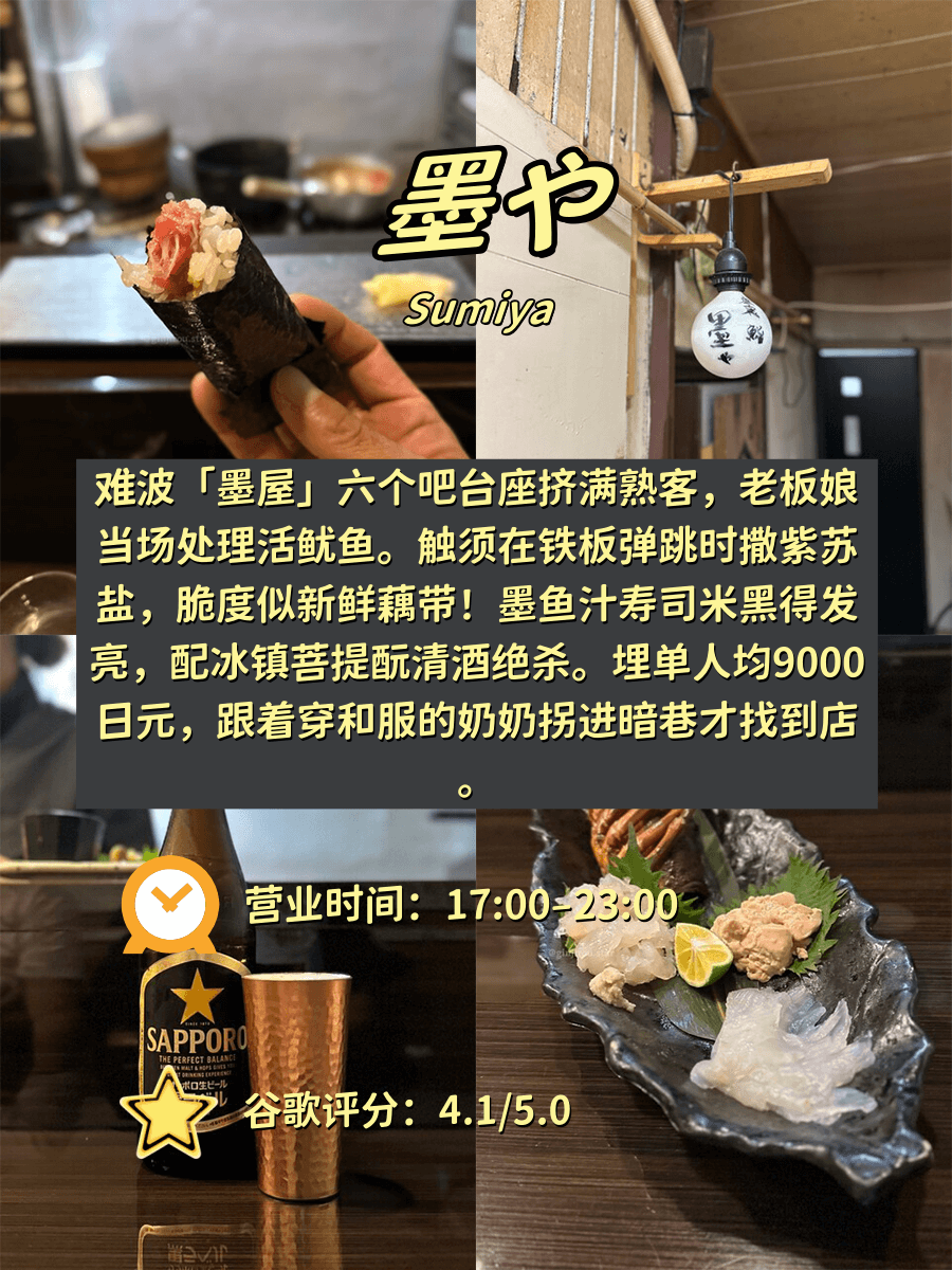 附位置线索+必点项+人均参考 ​​1️⃣ 墨屋(活鱿鱼专门店)​​ 📍 ​​难波站步行8分钟|暗巷内(跟穿和服奶奶走)​​⏰ 17:00-23:00|💰 ​​人…