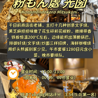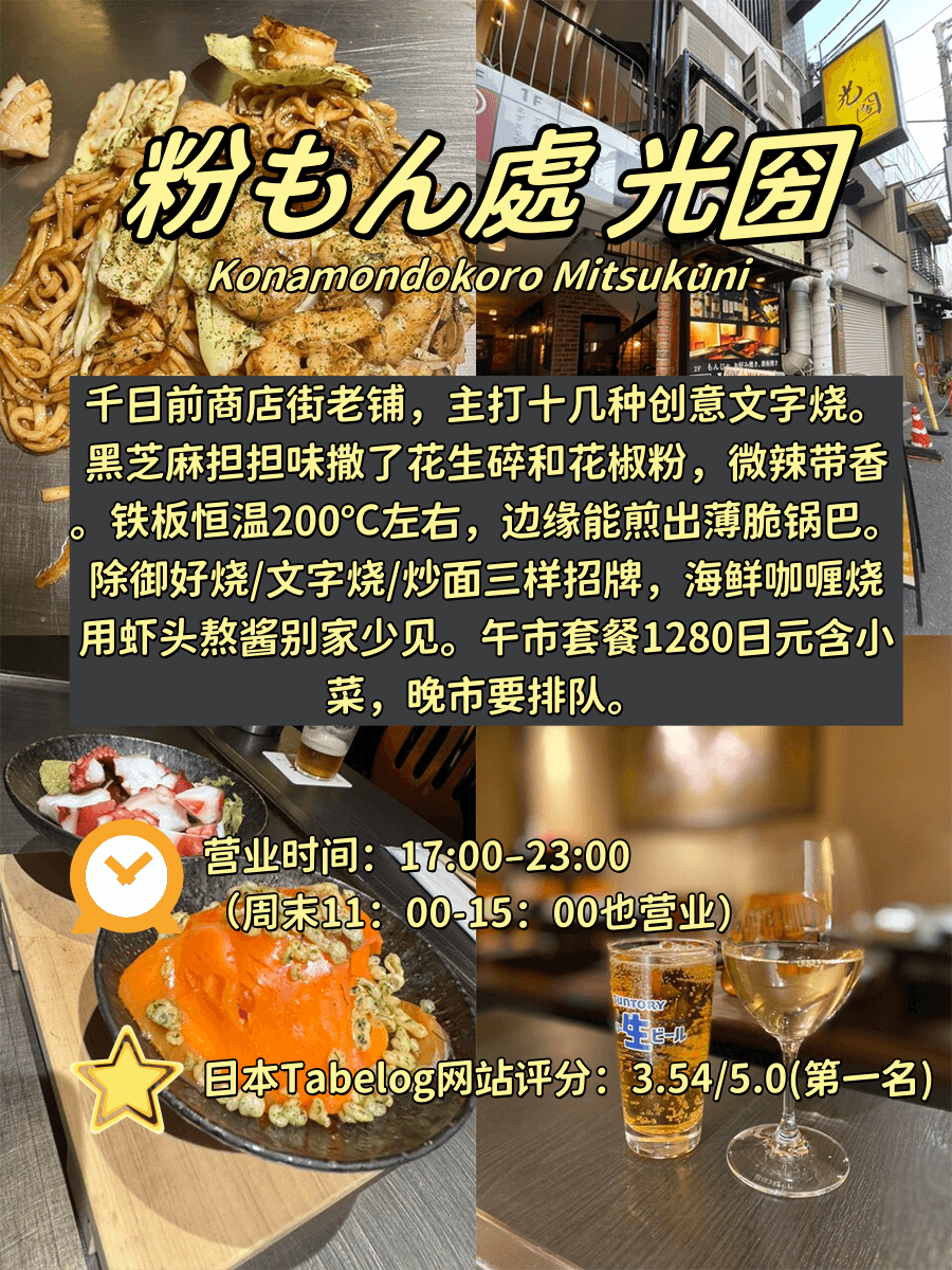 附营业时间+必点技巧+Tabelog实评分 1️⃣ 粉もん処 光圀|Tabelog 3.54分(第1名) 📍 千日前商店街|难波站步行约8分钟⏰ 工作日17:0…