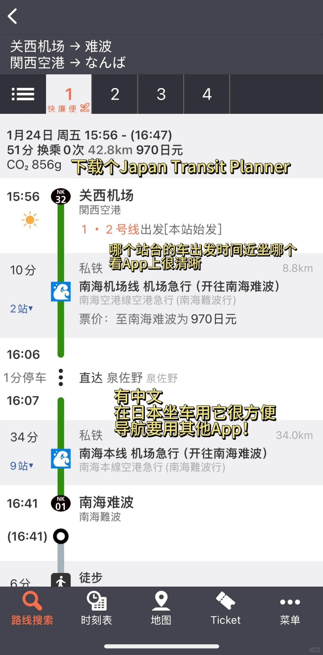 - Google Maps:导航+实时交通,步行路线更清晰(Japan Transit Planner仅建议查询车次)。