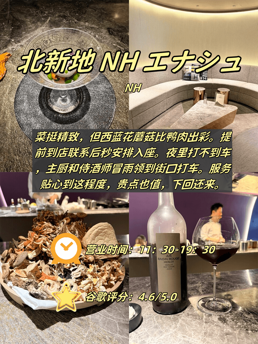 | 北新地 NH | 极致服务+菌菇料理 | 追求深夜餐饮者 | 午市13:00前 |