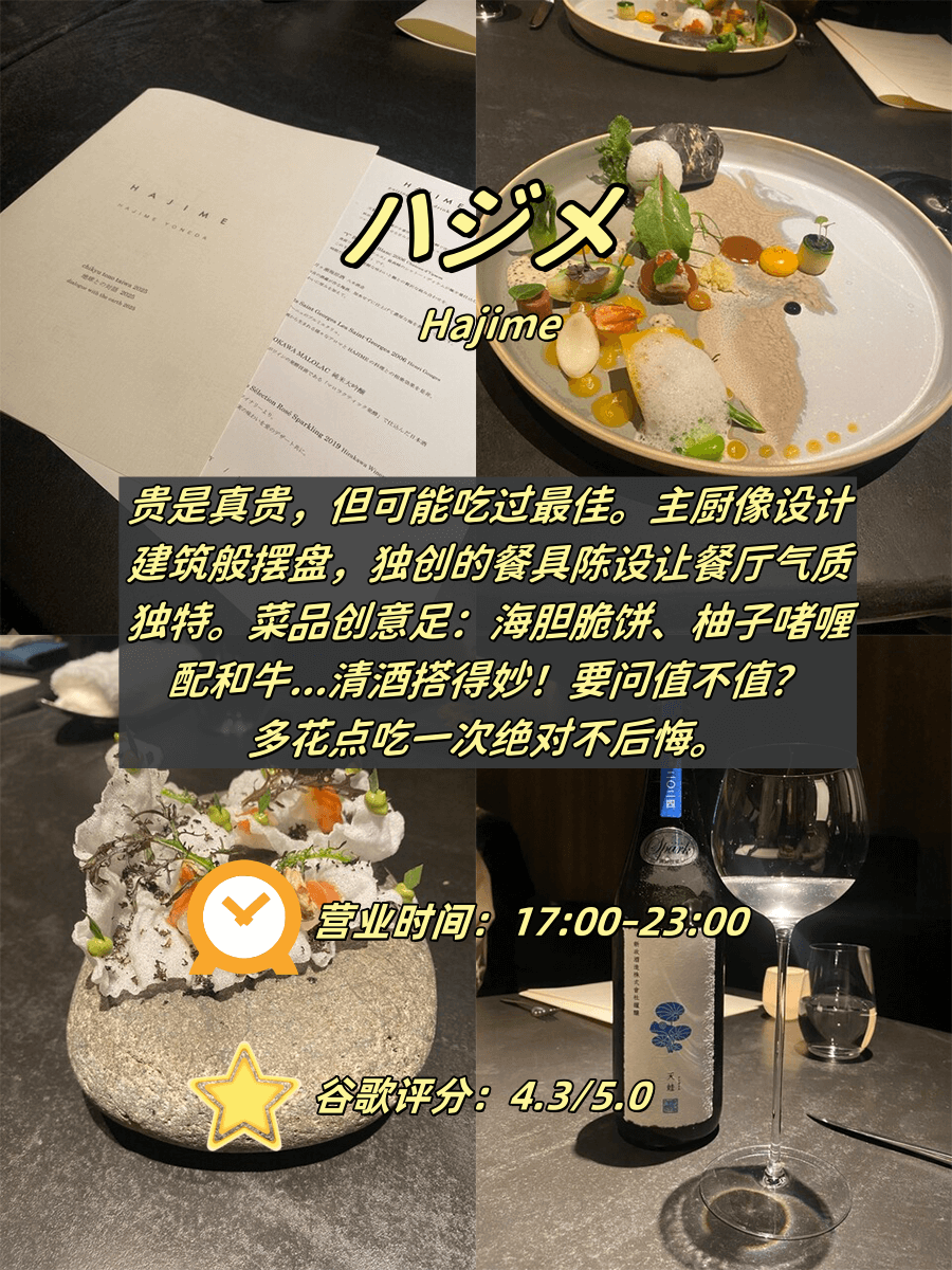 | Hajime | 艺术摆盘与创意融合菜 | 预算有限/重份量党 | 晚市第一场(17:00) |