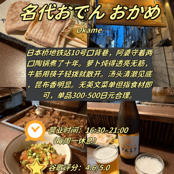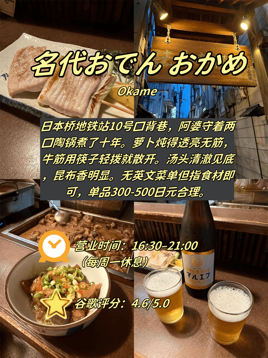 ​附营业刺客表+招牌吃法+位置实拍线索 ​​1️⃣ 名代おでん おかめ(关东煮十年老铺)​​ 📍 ​​日本桥站10号口背巷|难波站步行8分钟​​⏰ ​​16:3…